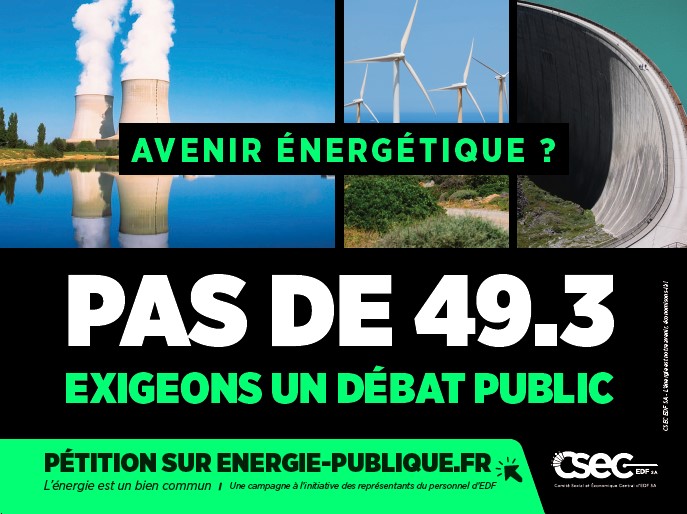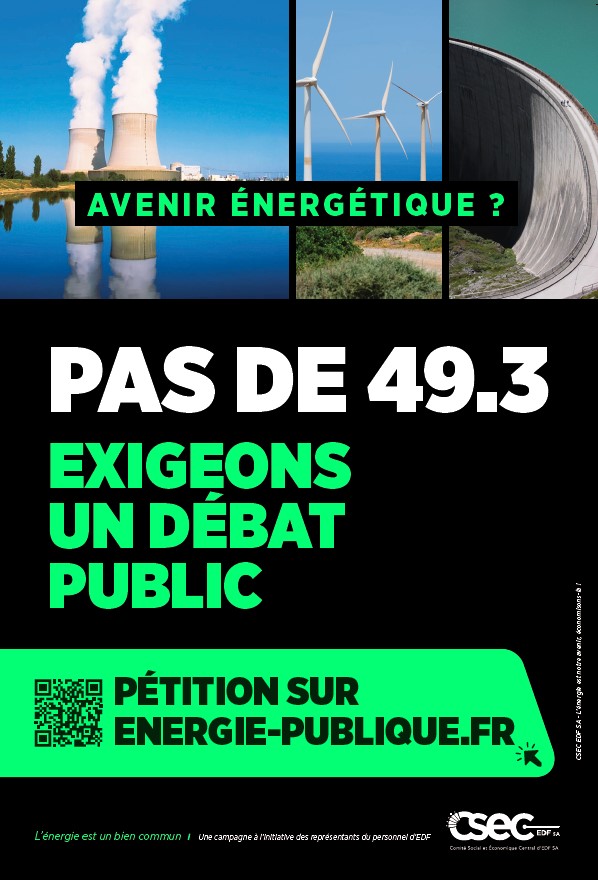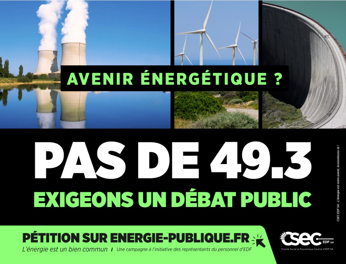 L’angle choisi pour la communication fait écho à l’actualité politique : refuser le 49.3 sur l’avenir énergétique du pays. Autrement dit, pas de passage en force sur l’énergie, mais un débat public, citoyen et démocratique.